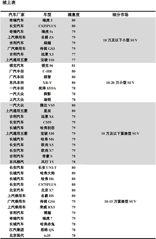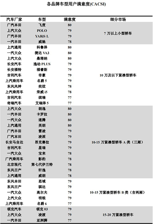 以价格、发动机排量和轴距综合划分细分市场车型,各细分市场CACSI第一(含并列第一)的车型是:
