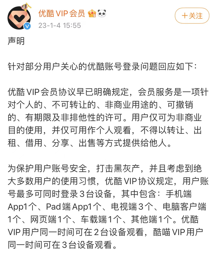 上述回应还称,“优酷VIP会员协议早已明确规定,会员服务是一项针对个人的、不可转让的、非商业用途的、可撤销的、有期限及非排他性的许可。用户仅可为非商业目的使用,并仅可用作个人观看,不得以转让、出租、借用、分享、出售等方式提供给他人。”