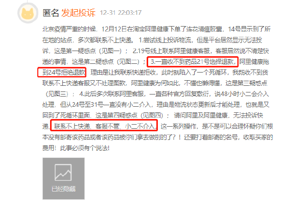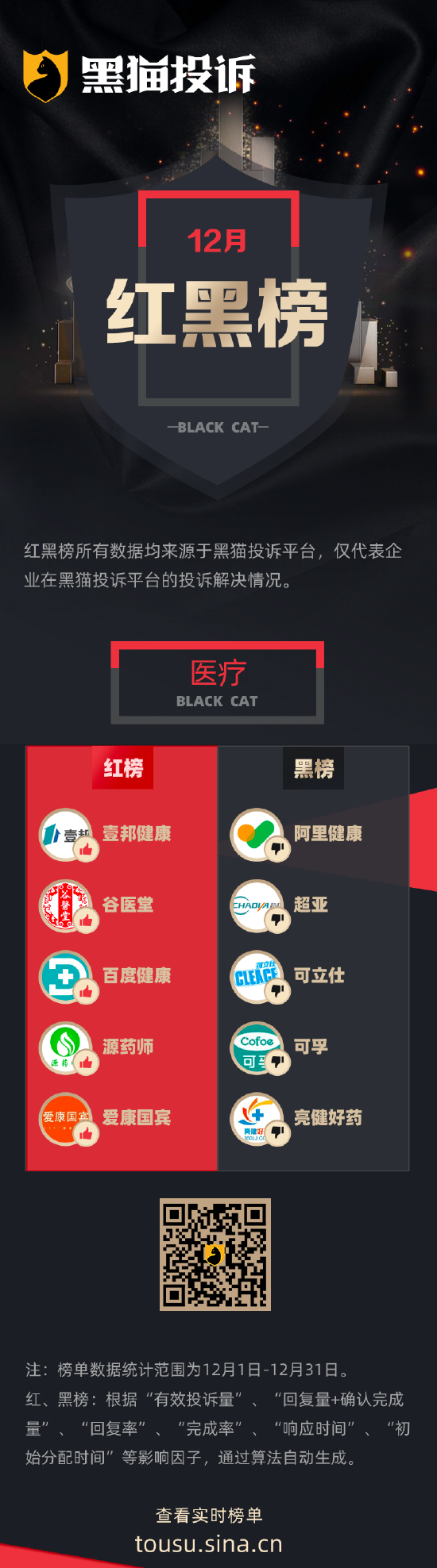 12月黑猫投诉医疗领域红黑榜:阿里健康漏发商品不退款
