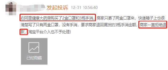 近日,有不少消费者在黑猫投诉平台反映称在阿里健康买的药品逾期不发货、客服不处理等问题。有用户表示在阿里健康买了2盒口罩和3瓶消毒液,商家只发了口罩,但却拒绝退还差价。截止12月底,阿里健康在黑猫投诉平台累积投诉5327单,回复率为0。