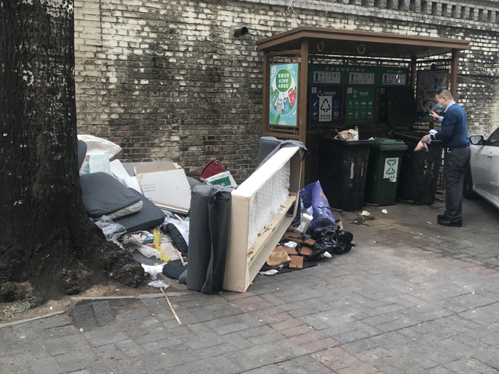 “这些垃圾堆在这儿少说得有半个月了,没人清理。”朝阳区白家庄东里14号楼居民向12345市民服务热线及本报反映,楼前的垃圾分类桶站周围堆满了装修垃圾,破败不堪的大沙发斜躺在桶站旁,扯碎的木板扔了一地。记者走访还发现,这种情况在老旧小区十分常见,垃圾分类桶站往往成了装修垃圾乱堆的“重灾区”。