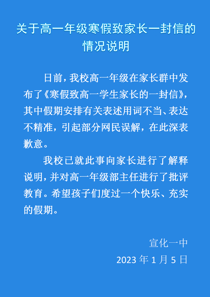 对此,微信公众号“宣化一中”1月5日发布情况说明称,日前,该校高一年级在家长群中发布了《寒假致高一学生家长的一封信》,其中假期安排有关表述用词不当、表达不精准,引起部分网民误解,在此深表歉意。