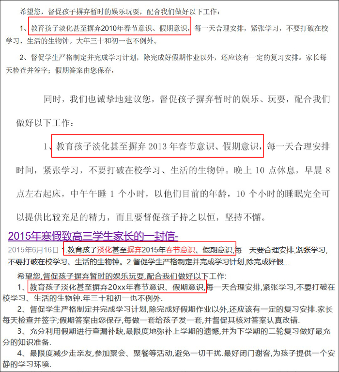 观察者网搜索“淡化摒弃春节意识”发现,从十几年前起,许多《致家长的一封信》模板中,就已经出现“教育孩子淡化甚至摒弃XX年春节意识、假期意识”的说法,这些模板内容都基本相似。