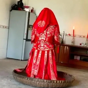 ▲视频中,一位新娘在簸箕中独坐了5小时。截图来自社交媒体视频