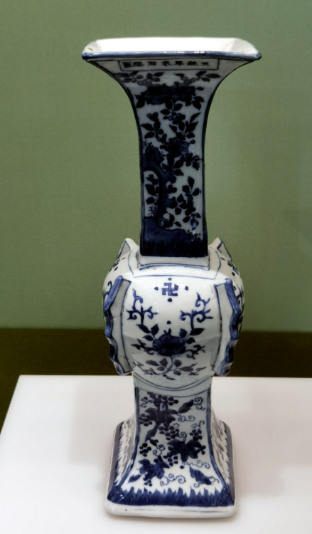 执壶旁边的青花瓷瓶则属于明代书画家米万钟。李伟建了清华园后,米万钟又在清华园东墙外导引湖水,辟治了幽雅秀丽的勺园。于是,在北京西郊一带,出现了亭台楼榭与湖光山色交相辉映的景象。