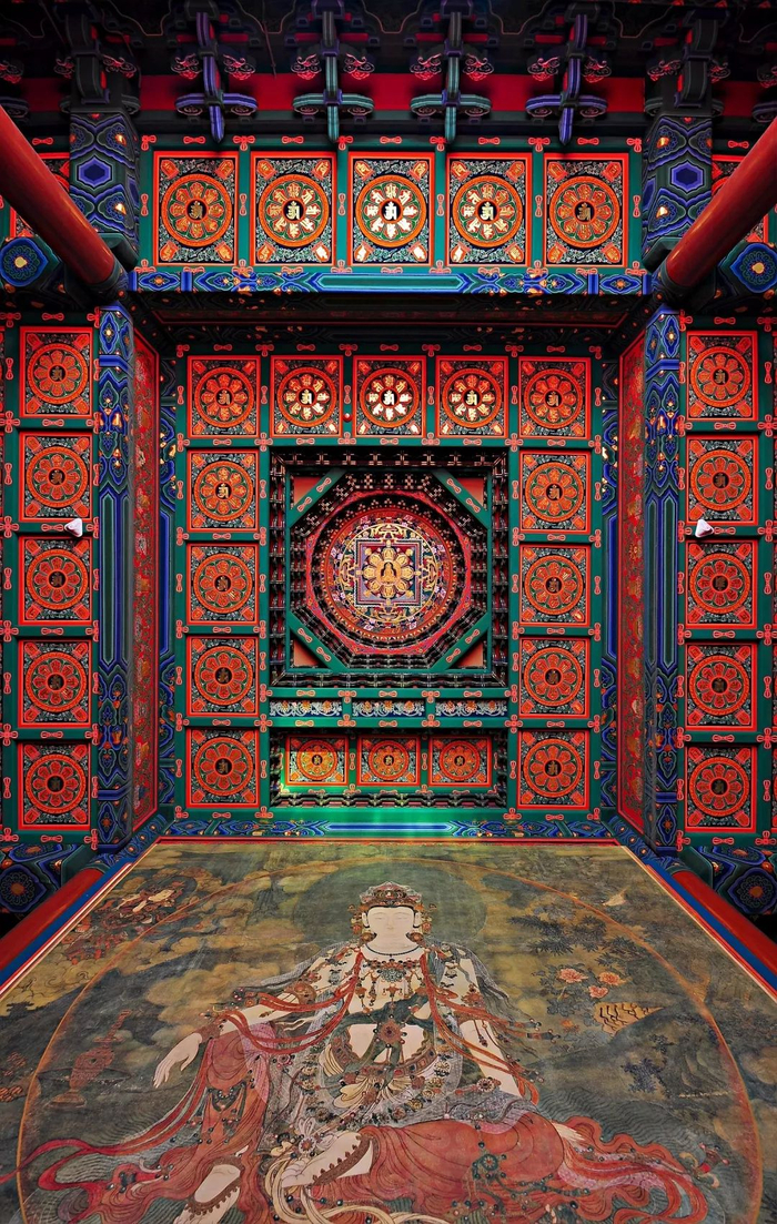 观赏过真迹,咱们再去不远处山脚下的艺术馆里观看详解,或许可以获得更多感触。法海寺壁画艺术馆由原西山翠林茶社改建而成。从门外看,艺术馆在青山和苍松翠柏的掩映下古色古香,朱漆木门上书“翠微丹青”。推开木门,内部别有洞天。馆内设置了接待大厅、序厅、壁画厅、球幕厅、复原厅、尾厅等展示空间,将法海寺壁画的前世今生、技术细节、历史文化、艺术价值等娓娓道来。