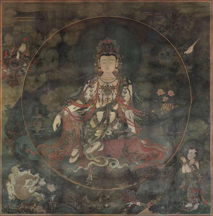 大雄宝殿的六面墙上,至今完整保留着九幅极其精美的明代壁画,分布在大雄宝殿北墙门的两侧、中佛像座龛背后和十八罗汉身后两面山墙上,面积达236.7平方米。佛龛背壁的三幅,画的是水月观音、文殊菩萨、普贤菩萨。东西墙上,画的是传说故事中的天帝、帝后、天王、信女、力士和童子等,共有35个人物,高的近2米,矮的只有50厘米,并有祥云、花卉、动物等衬托。