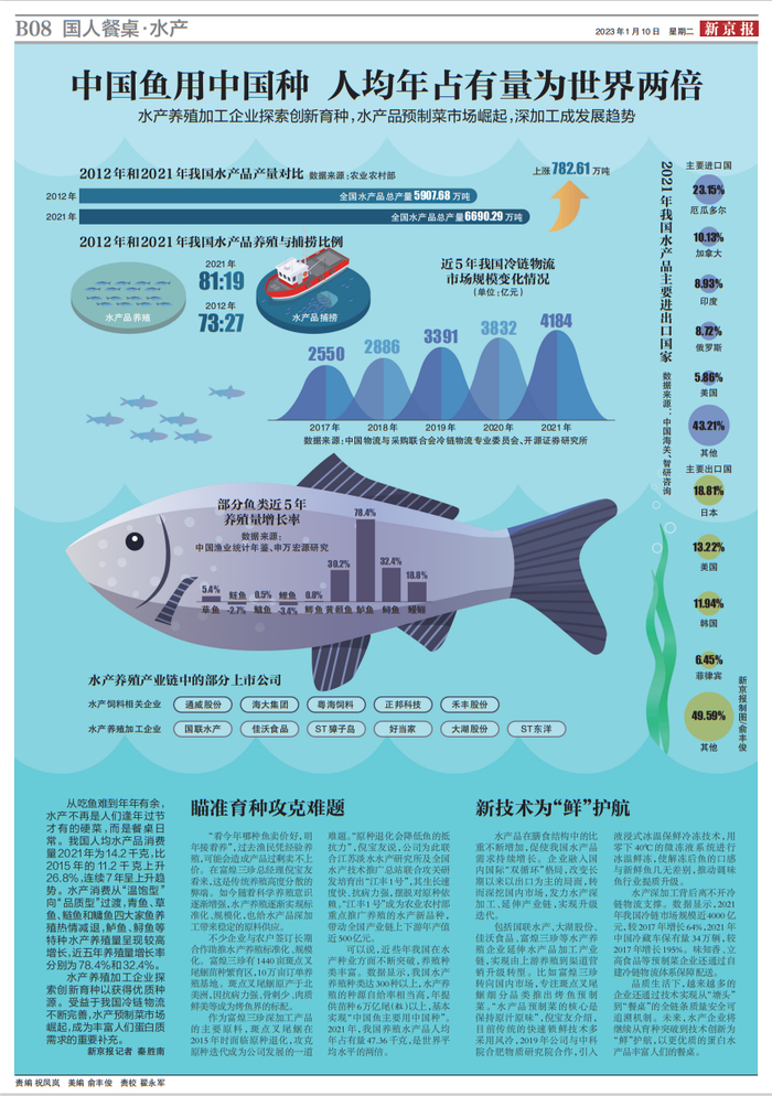 可以说,近些年我国在水产种业方面不断突破,养殖种类丰富。数据显示,我国水产养殖种类达300种以上,水产养殖的种源自给率相当高,年提供苗种6万亿尾(粒)以上,基本实现“中国鱼主要用中国种”。2021年,我国养殖水产品人均年占有量47.36千克,是世界平均水平的两倍。
