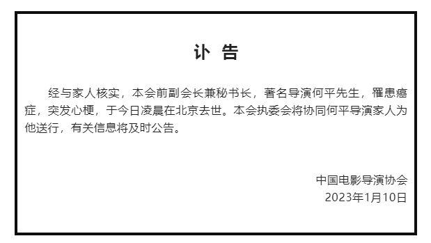 1月10日,中国电影导演协会发布讣告称,导演何平罹患癌症,突发心梗在北京去世,享年65岁。消息传来,电影圈一片悲伤叹息。