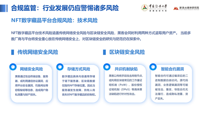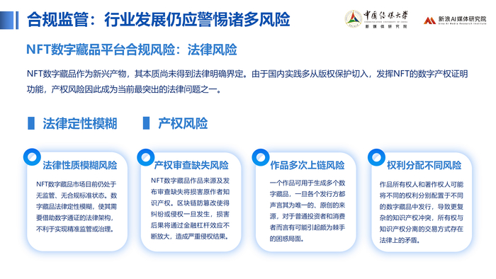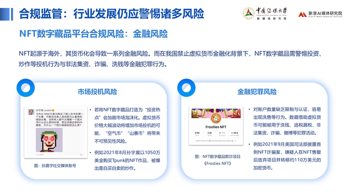 看点10 :合规致远是中国数字藏品行业理性发展的另一关键词。中国数字藏品行业稳健发展急需以合规监管为前提,协同发挥政府监管、技术规制、法律规制、平台规制、行业自律、公民教育等合力,以多元主体协同治理应对数字藏品行业发展面临的技术风险、金融风险、法律风险等多元风险。
