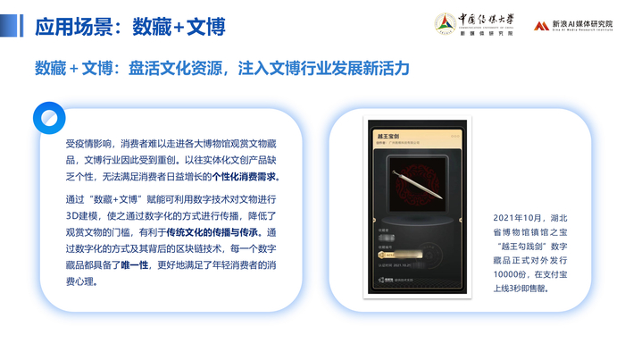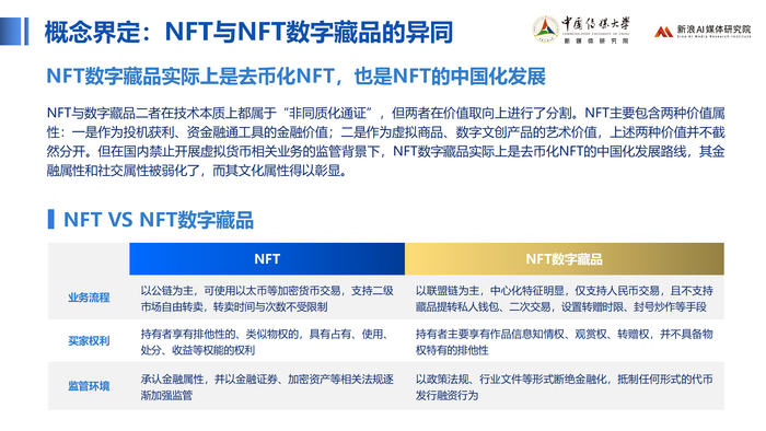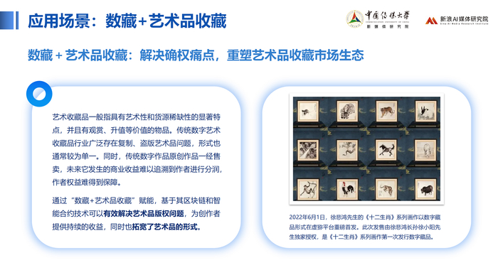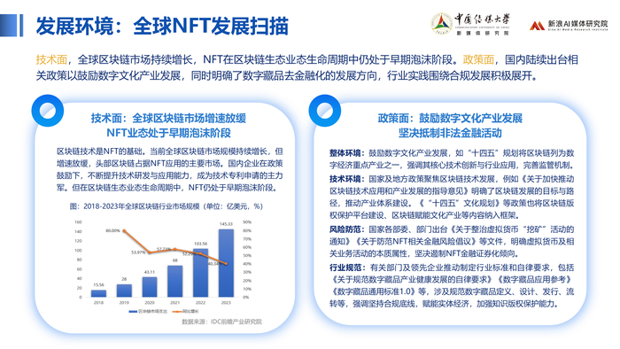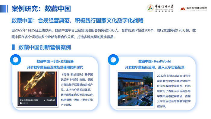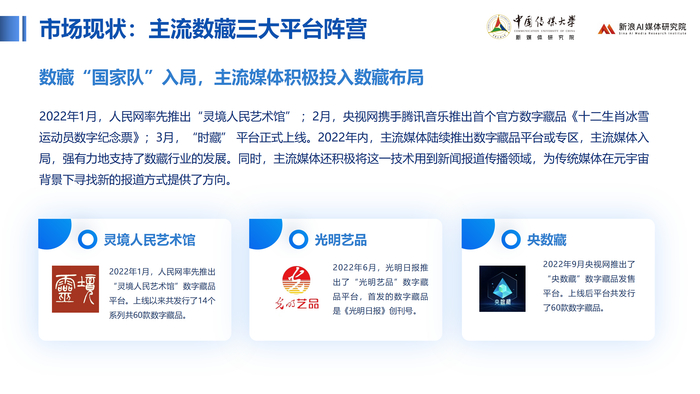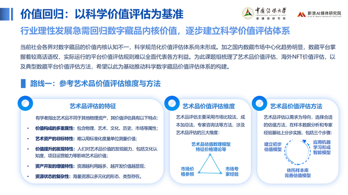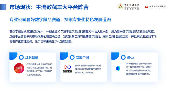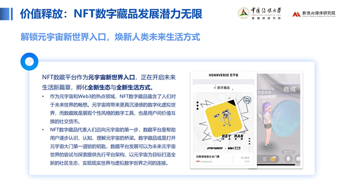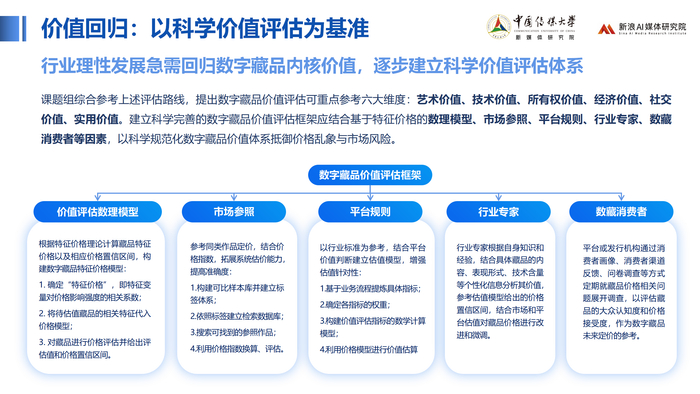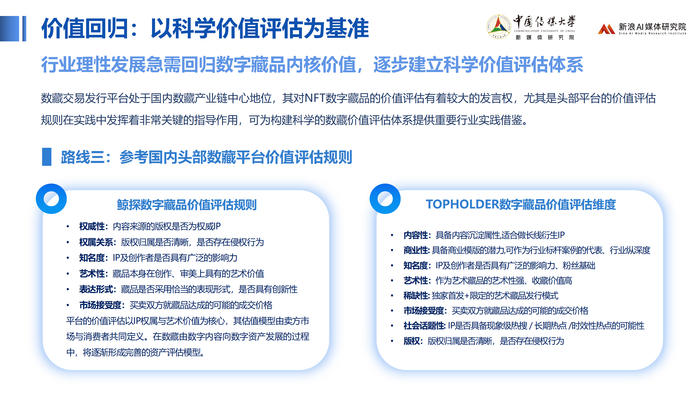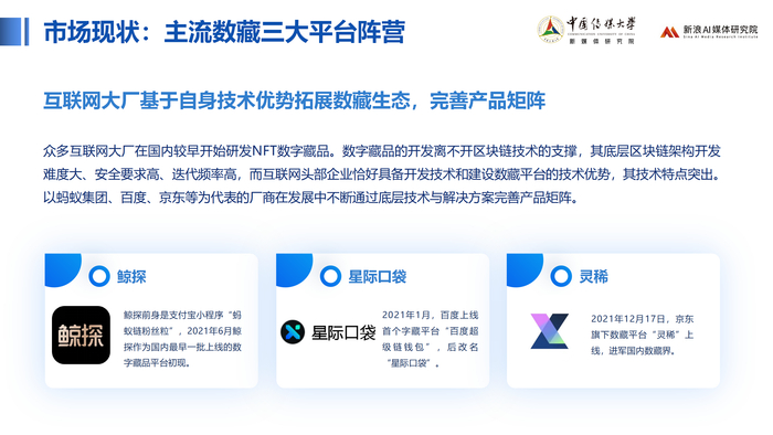 在元宇宙与Web 3.0热潮合推下,国内NFT数字藏品行业发展如火如荼,行业规模快速增长,整体发展步入合规建设提速期。2023年1月12日,中国传媒大学新媒体研究院与新浪AI媒体研究院联合发布《价值回归 合规致远:中国数字藏品主流平台创新研究报告》。作为国内NFT数字藏品领域产学研用协作创新的重磅成果,本研究报告聚焦NFT数字藏品行业发展价值回归与合规致远两大关键词,深入挖掘国内领先数字藏品平台先进经验,前瞻探索国内数字藏品价值评估框架与合规发展路径,洞察把握行业创新突破的未来态势。
