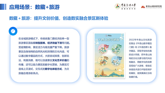看点5:从发展历程来看,“万物皆可NFT数藏化”,其应用场景非常广阔:“数藏+艺术品收藏”可解决确权痛点,重塑艺术品收藏市场生态;“数藏+文博”可盘活文化资源,为文博行业注入发展新活力;“数藏+旅游”可提升文创价值,打造数实融合的景区新体验;“数藏+体育”可拓展体育消费,挖掘体育产业新动能。同时,数字藏品在音乐、游戏、新闻出版、数字营销等领域不断拓展衍生场景,为行业发展创造无限可能。