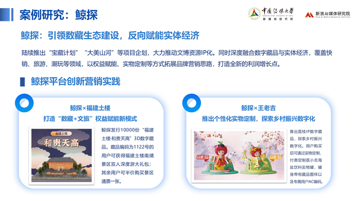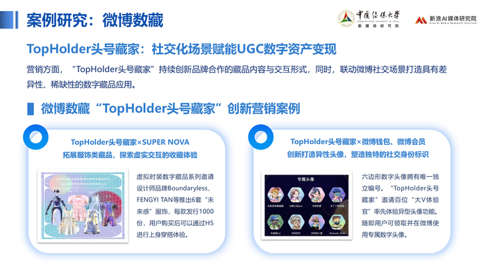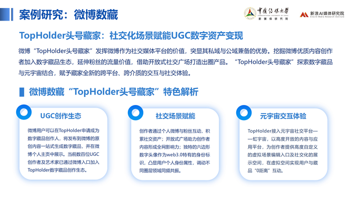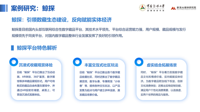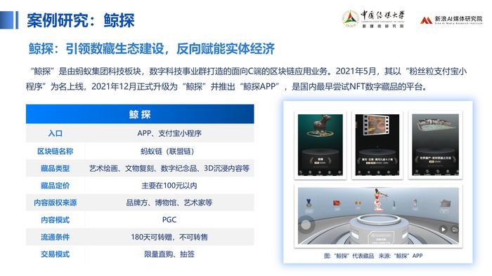 看点7:聚焦国内领先主流数藏平台,“鲸探”、微博“TopHolder头号藏家”、“数藏中国”、新华社数字藏品是三类数藏平台的典型代表。其中,综合性数藏平台“鲸探”积极引领国内数藏生态建设,反向赋能实体经济创新举措卓有成效;微博数字藏品官方服务商“TopHolder头号藏家”以社交化场景赋能UGC数字资产变现,强力支撑微博数字藏品业务发展;“数藏中国”积极探索合规经营、元宇宙场景等,积极践行国家文化数字化战略;数藏“国家队”新华社创新探索“数藏+新闻”实践,高效赋能新闻传播,探索主流媒体深融新路径。