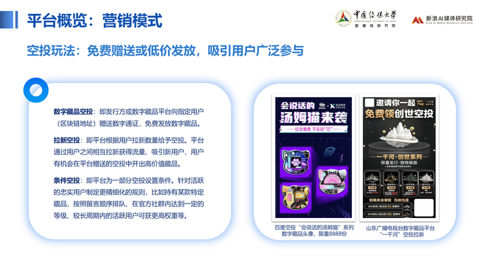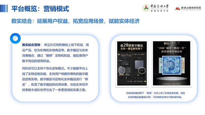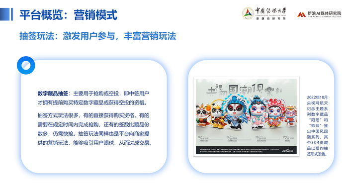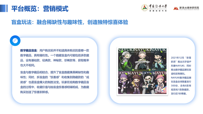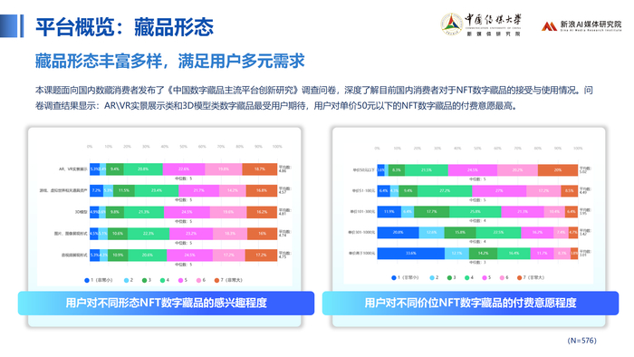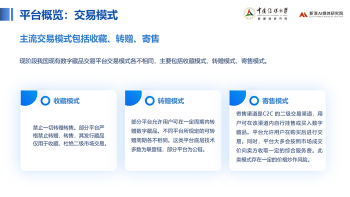 看点6:产品形态方面,国内主流数藏平台已推出2D、3D、音频、视频等形态丰富的数字藏品,本课题调查问卷结果显示AR\VR实景展示类和3D模型类数藏最受用户期待,用户对单价50元以下的NFT数字藏品的付费意愿最高。交易模式方面,国内主流数藏交易平台主要提供收藏、转赠、寄售三类模式。营销模式方面,国内主流数藏交易平台百花齐放,推出空投、抽签、盲盒、合成、数实结合等创意玩法,不断为用户带来惊喜体验,拓宽数藏应用场景。