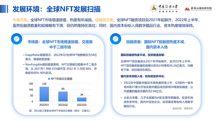看点2:技术方面,区块链技术全球市场增速逐渐放缓,NFT仍处于其生态业态生命周期的早期泡沫阶段。政策方面,国内陆续出台政策鼓励数字文化产业发展,明确数字藏品去金融化的发展方向,引导行业实践围绕合规发展展开。市场方面,全球NFT市场增速放缓,热度有所减弱。投融资方面,全球NFT融资项目在2022年上半年数量和规模略有下滑,但仍维持在高位。国内资本持续入局,投资机构多样化。