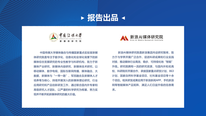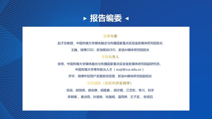 本报告是中国传媒大学新媒体研究院与新浪AI媒体研究院长期合作成果之一。该课题由新媒体研究院院长赵子忠教授与微博COO、新浪移动CEO、新浪AI媒体研究院院长王巍担任首席专家,由新媒体研究院副教授、中国传媒大学青年拔尖人才徐琦与微博年轻用户发展部总经理、新浪AI媒体研究院副院长乔宇担任项目负责人,由中国传媒大学新媒体研究院与新浪AI媒体研究院团队共同完成。