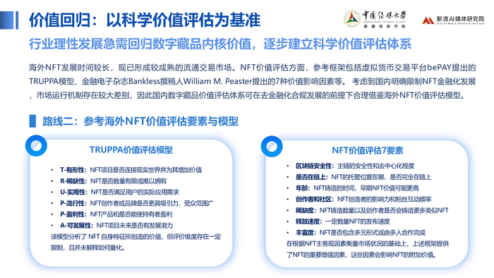 看点8:当前社会各界对数字藏品的价值内核认知不一,市场泡沫与行业乱象依然存在。中国数字藏品行业理性发展急需回归数字藏品内核价值,具体可借鉴艺术品价值评估、海外NFT价值评估与国内头部数藏平台价值评估实践,主要依托数字藏品艺术价值、技术价值、所有权价值、经济价值、社交价值、实用价值六大维度,同时结合基于特征价格的数理模型、市场参照、平台规则、行业专家、数藏消费者等因素,建立数字藏品价值评估框架,以科学规范化数字藏品价值体系抵御价格乱象与市场风险。
