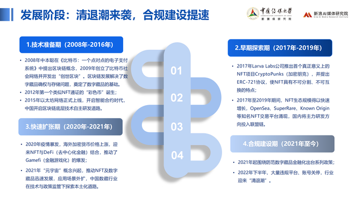 看点3:从发展历程来看,全球NFT与数字藏品行业发展经历了四个主要阶段,分别为技术准备期、早期探索期、快速扩张期以及合规建设期。2021年以来,国内NFT数字藏品平台大量涌现,行业规范与整治持续推进。2022年下半年,大量违规平台、账号关停,数字藏品行业迎来“清退潮”。