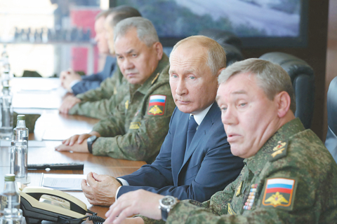 格拉西莫夫是普京军事团队的核心成员。图为2020年9月,格拉西莫夫(右一)陪同普京和绍伊古观摩“高加索-2020”军事演习。