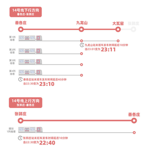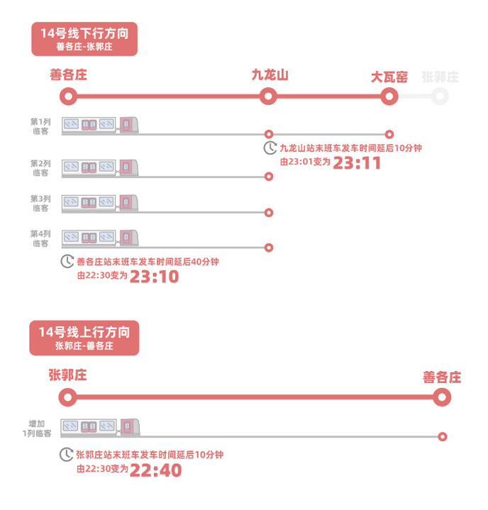 下行方向,善各庄站至大瓦窑站区段加开1列临客,善各庄站至九龙山站区段增加3列临客。善各庄站末班车发车时间由原来的22:30变为23:10,延后40分钟,行车间隔10分钟,共计覆盖13个车站(善各庄站到九龙山站);九龙山站末班车发车时间由原来的23:01变为23:11,延后10分钟,共计覆盖18个车站(平乐园站到大瓦窑站)。