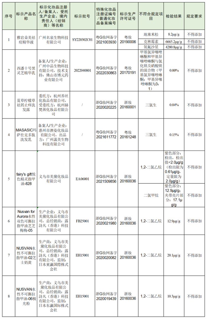 根据《化妆品监督管理条例》《化妆品生产经营监督管理办法》,国家药监局已要求广东、浙江省药品监督管理部门对上述不符合规定的化妆品涉及的备案人、受托生产企业依法立案调查,责令相关企业立即依法采取风险控制措施并自查整改。