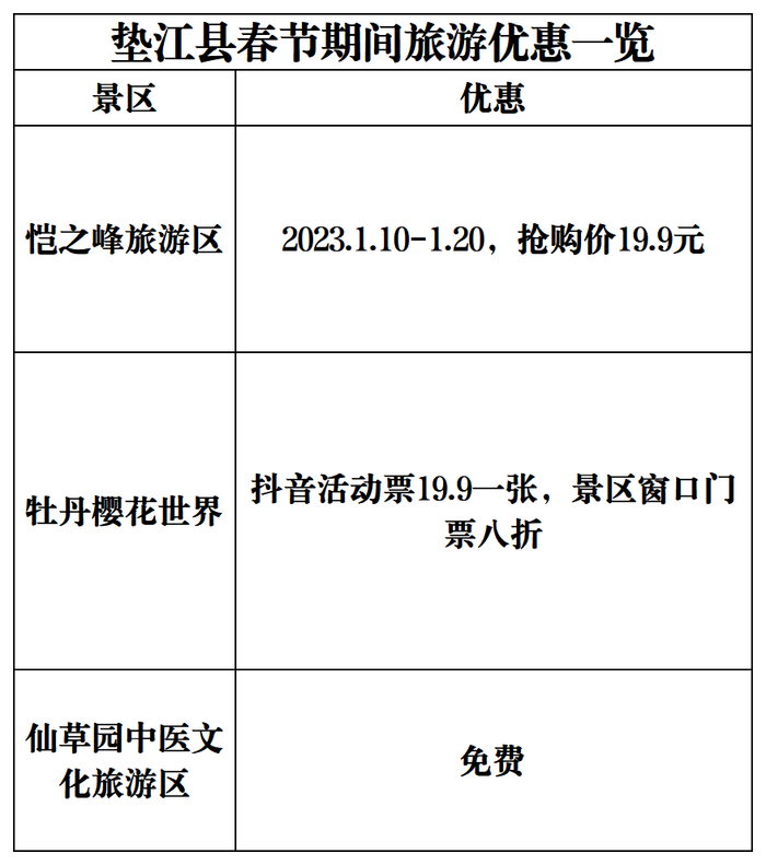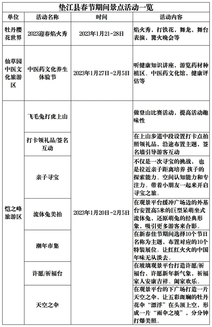 垫江正力争通过明月山乡村振兴示范带建设,唱响成渝“双城记”,擦亮重庆文旅新名片。其中重点打造的两个AAAA级景区——牡丹樱花世界和恺之峰旅游区,以及仙草园中医文化旅游区,纷纷在过年期间特别推出了“2023迎春焰火秀”“中医药文化养生体验节”“潮年市集”等活动。