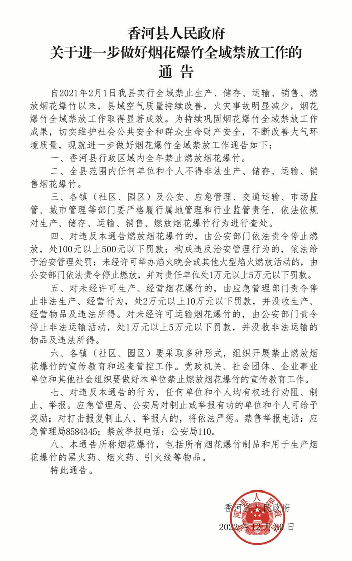 承德市双滦区人民政府2022年12月27日发布关于在双滦区全域禁止销售和燃放烟花爆竹的通告。通告内容显示——