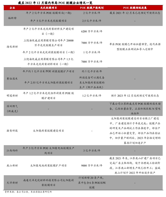 截至2022年12月,国内规划布局的POE胶膜可计算产能合计达36.12亿平方米/年,产能规划超1亿平方米/年的企业就有福斯特、海优新材、赛伍技术、明冠新材和江西纬科等。其中,福斯特年产2亿平方米POE胶膜项目(一期)已在2021年底达预定可使用状态,明冠新材年产1.2亿平方米光伏组件封装用POE胶膜扩建项目预计于2023年12月达到预定可使用状态。