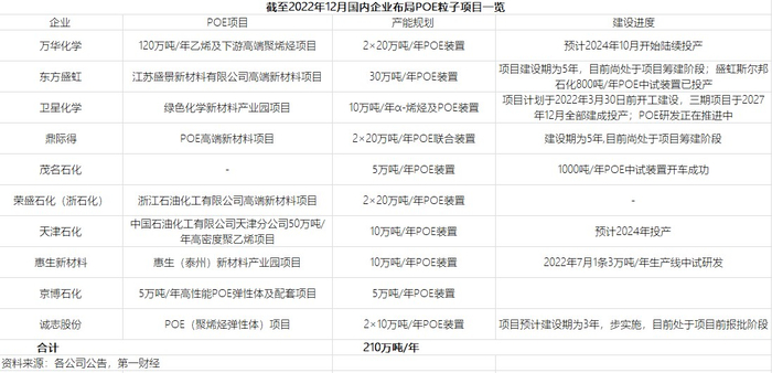 据第一财经统计,国内已规划POE粒子产能约为210万吨,多数企业通过中试-放大稳健推进,目前进度较快的为万华化学、茂名石化、东方盛虹等。根据各企业产能规划及项目推进情况,考虑到项目试车及产能爬坡,2024年有望实现国产化量产突破。