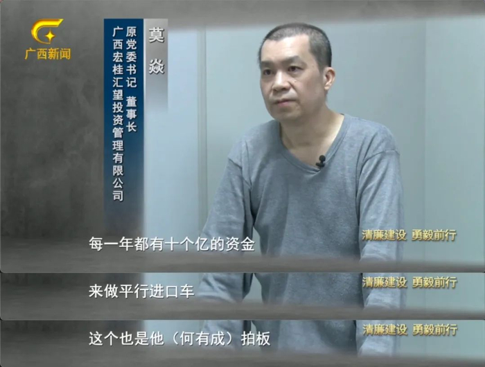 其下属——广西宏桂汇望投资管理有限公司原党委书记、董事长莫焱,为了迎合何有成的好大喜功,也为捞取巨额利益,向何有成提出搞实际属于融资性贸易的平行进口汽车贸易,并陆续以金钱铺路,送给何有成现金共计700万元。