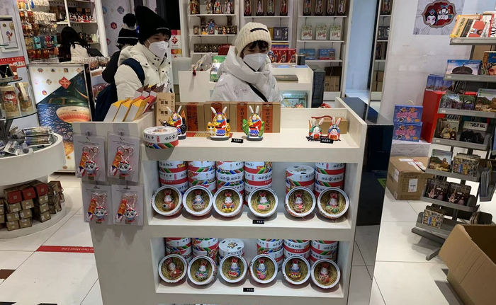 “今天店里同时段最多也就十几个人,前两天周末人更多,店里几乎没有下脚的地方,结账都得排队。”店内的工作人员说,临近春节,大家都想带点伴手礼回去,今年又是兔年,店里的兔墩墩和兔儿爷卖得特别好。早晨,一进门的柜子里原本整整齐齐地摆放着48个包装好的兔儿爷,如今只剩下8个。