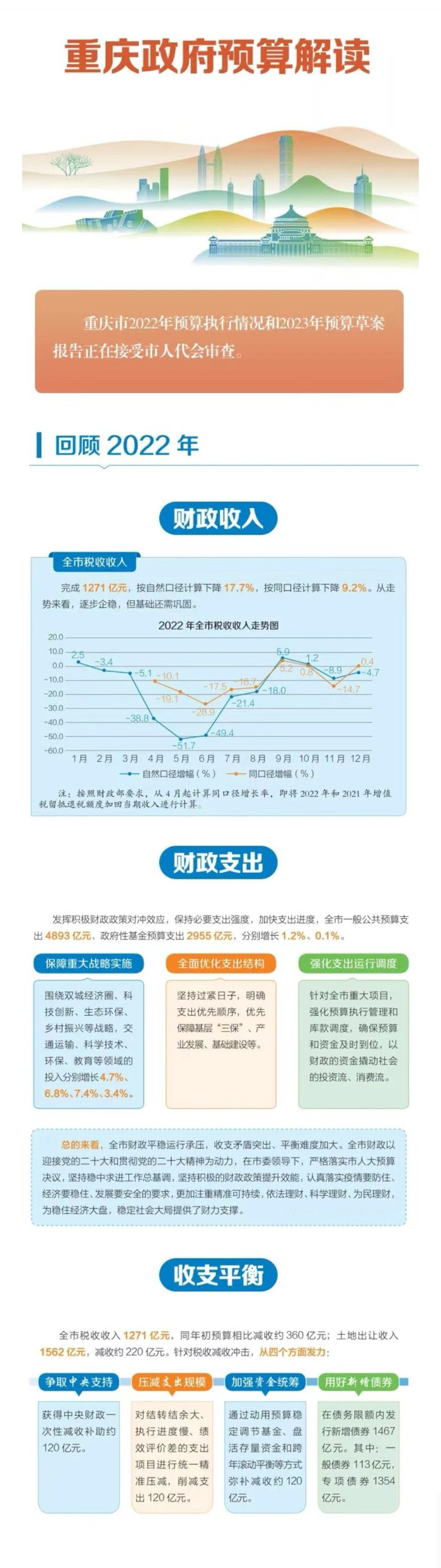 2022年,重庆财政收支情况如何?2023年重庆两会期间,重庆市2022年预算执行情况和2023年预算草案报告接受市人代会审查。 数据显示,2022年,重庆全市税收收入完成1271亿元,按同口径计算下降9.2%。