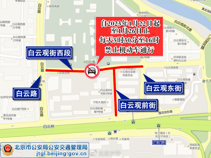 1月22日(正月初一)起至1月26日(正月初五)止,每天5时30分至16时,白云观街西段(白云路至白云观东街段)和白云观前街禁止机动车通行;