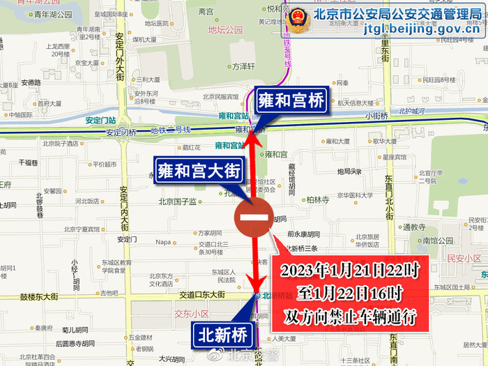 交管部门将视道路通行情况,适时对热点地区周边车流集中的道路采取临时交通管理措施,保障区域交通通行安全有序。结合雍和宫、白云观祈福活动客流量较大的情况,对周边部分道路采取临时交通管理措施,避免客流和车流交织引发的危险,并发布通告:1月21日(除夕)22时至1月22日(正月初一)16时,雍和宫大街由雍和宫桥下路口(不含)至北新桥路口(不含)双方向禁止车辆通行;