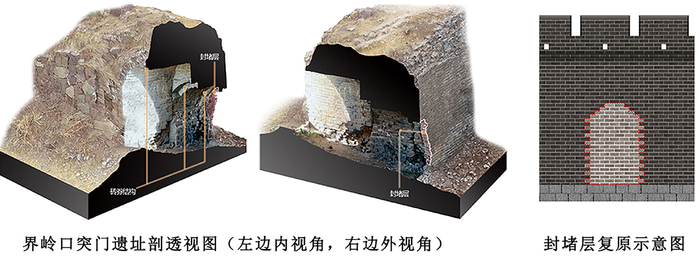 “三道关之石城,可顿万人,开突门为夜击”,突门所蕴藏的古老军事智慧为明长城所承袭,但其外侧封堵层结构脆弱,难于保存,目前三道关突门已全无踪迹,其他区段偶有遗迹也极易被误认为墙体破损而被忽视或遭“破坏性修缮”。