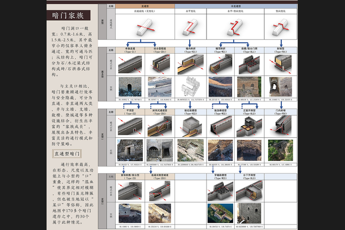 因暗门要兼顾通行效率与安全隐蔽,分为直通、非直通两大类;并与主墙、支墙、敌楼、登城道、马市等多种设施结合,衍生出丰富的暗门通行模式。