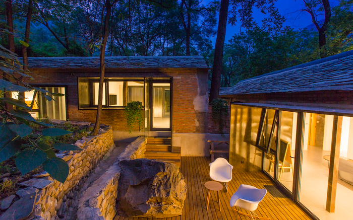 通过设计和改造,每个角落都尽可能地让风景和光线进入视野。比如,房间大部分都有大面积的玻璃窗,阳光穿过树叶和古老的窗棂照进屋子,有的客房直面山景,有的则竹影扑面,住在里面心情都会灿烂。客人们最喜欢的空间便是餐厅,它其实是将一处坍塌的房舍顺势改为室外就餐凉亭,长桌延伸到院中,与室内餐厅形成了半露天、半闭合的状态。
