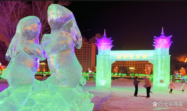 夜晚,冰雕亮起了灯,旁边的大树也挂上了五颜六色的彩灯,烘托出节日的氛围。