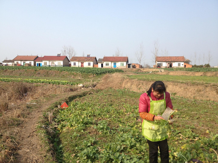 2013年春节。母亲身后的农田是昔日面貌,农田不仅小还没有机耕道,拖拉机到此处耕种,需要穿过重重农田,耕种全靠牛耕犁耙、肩挑背驮。新京报记者 罗道海 摄