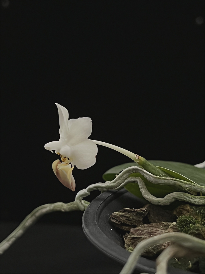 洛比蝴蝶兰根扁平,叶长5-10cm、宽3-5cm,椭圆形,深绿色。花期为晚冬至早春。总状花序,花梗直立,着花数朵,花径2-2.5cm左右,非常小巧可爱。花萼和花瓣洁白,花瓣直立,犹如兔子耳朵,故被称作“小白兔”。