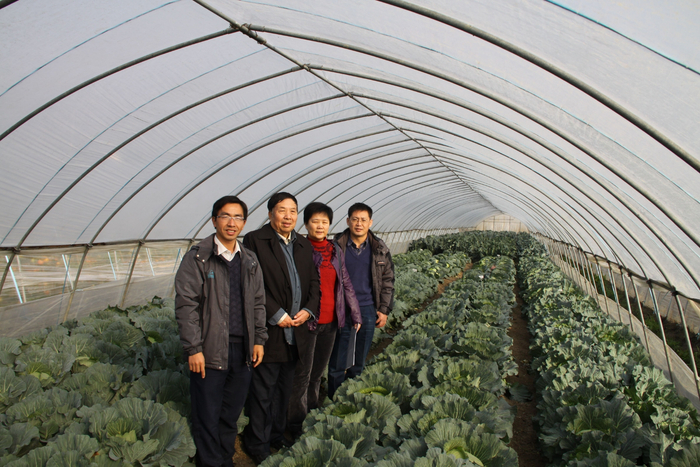 2012年12月,方智远院士(左二)和杨丽梅(左三)、庄木(左四)、张扬勇(左一)在安徽调查甘蓝品种试种情况。中国农科院蔬菜花卉研究所供图