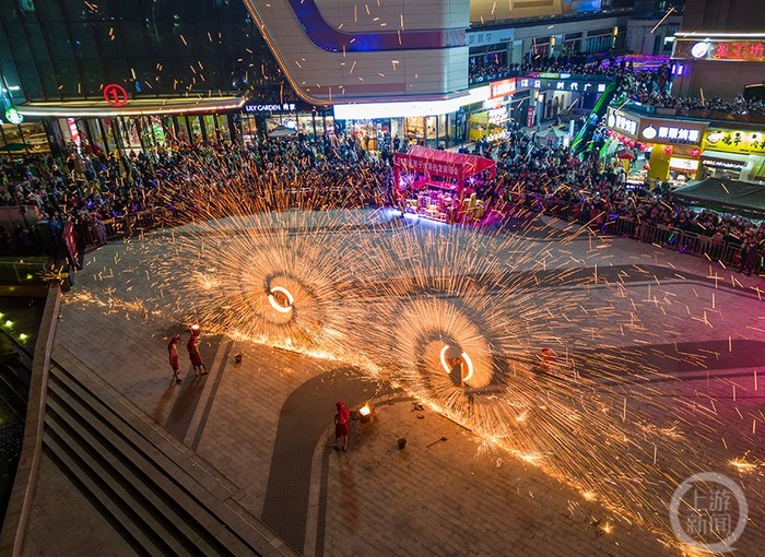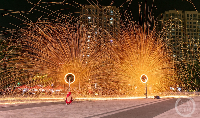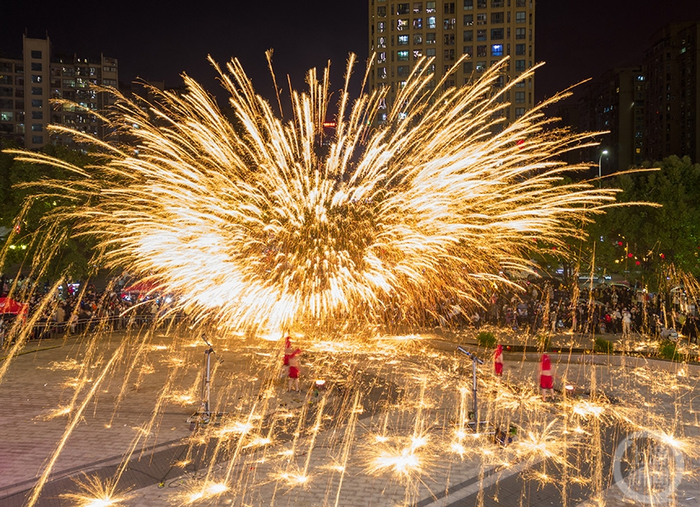夜幕下,只见一名表演者从熔炉中舀出铁水,将铁水抛起,另一名表演者则用花棒奋力向空中击打,高温的铁汁迅速崩裂开来,在夜空中绚烂绽放,前来观赏的市民游客和摄影爱好者纷纷拿出手机和专业相机记录这美妙的瞬间。