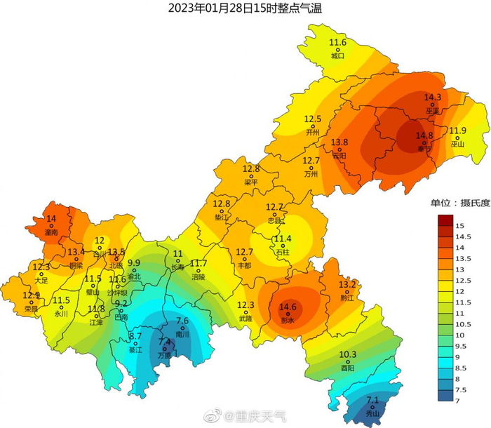 晒太阳嘞!今(28)日15时,上游新闻从重庆市气象台获悉,重庆东北部天空状况相对较好,奉节、巫溪已超14℃,其中奉节高达14.8℃。重庆其余大部地区气温在10℃以上,沙坪坝达到了11.6℃。