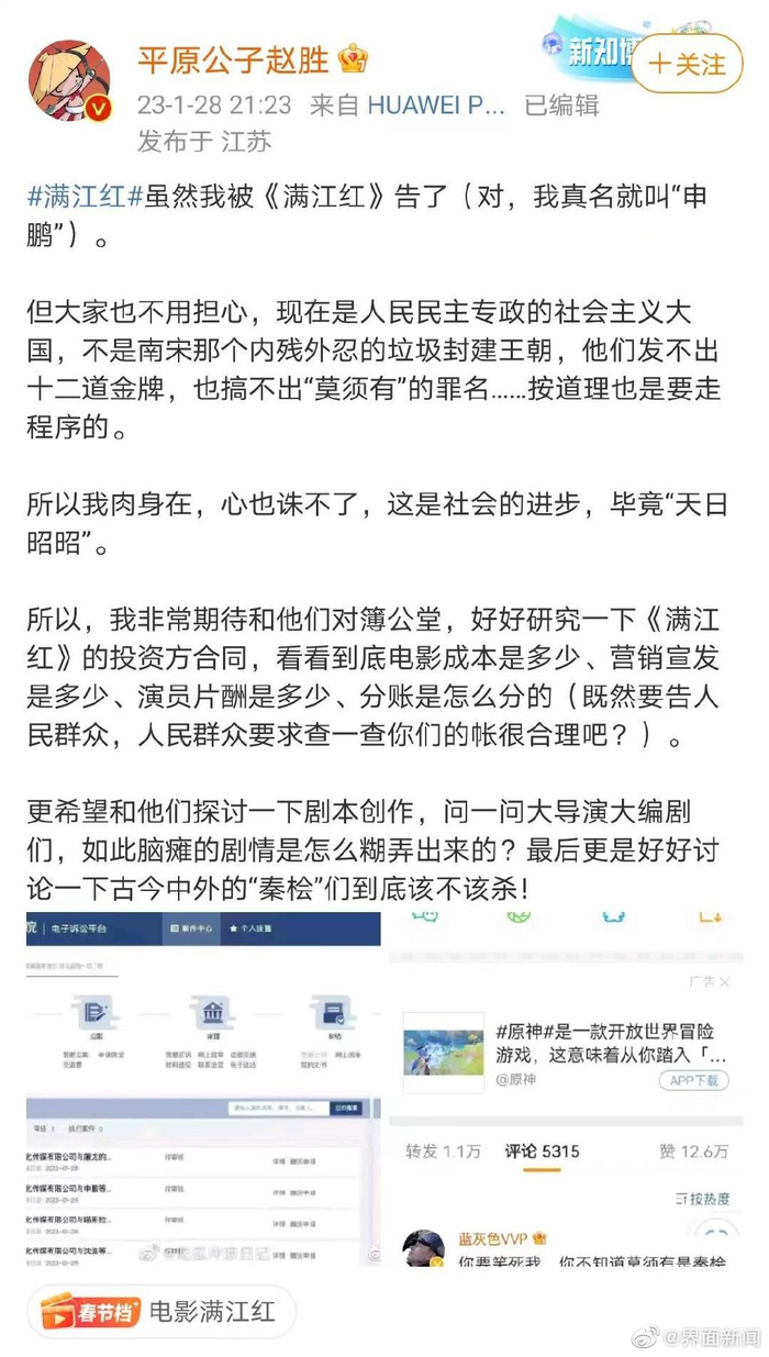 [#4位大V回应被满江红片方起诉#]1月28日、电影《满江红》通过官博晒出电子诉讼平台截图,表示“部分用户通过网络平台捏造有关电影《满江红》的不实信息并大量传播,严重危害了影片的合法权益,现正式对以下造谣者提起诉讼。” 被电影《满江红》片方起诉的沈逸、屠龙的胭脂井、平原公子赵胜和喵斯拉4位博主均已作出回应。