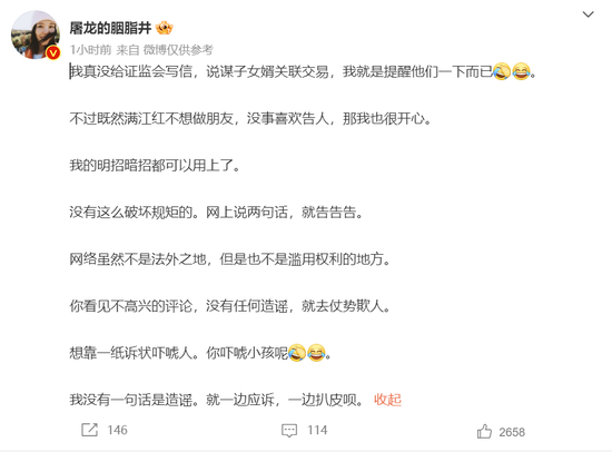 另外,@屠龙的胭脂井称,“网络虽然不是法外之地,但是也不是滥用权利的地方。”