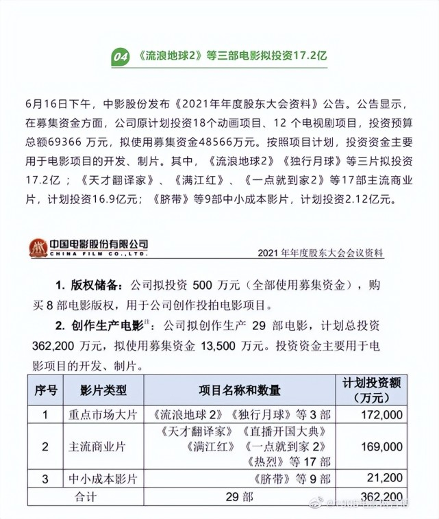 一般来说,片方对制片成本都秘而不宣,但《满江红》的制片成本并不是秘密。早在去年6月份,《满江红》的主要投资方中影曾发布年度股东大会资料。其中显示包括《满江红》在内的17部主流商业片,计划投资额为16.9亿元,这意味着平均到一部电影的投资额大概在1亿元左右。