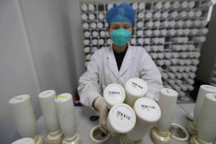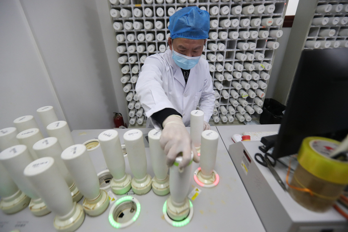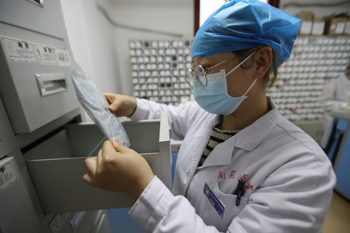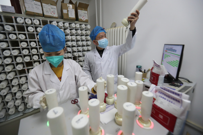 近日,伴着智能制药机器的轰鸣和哪怕隔着口罩也能隐隐闻到的中药香,记者来到位于医院地下一层的互联网颗粒药房。只见备货充足的百余箱中药配方颗粒整齐地码放在走廊两侧,进入药房后映入眼帘的是满满一面墙的400余个白色圆筒,里面装的是一味味经过独立提纯的中药配方颗粒,基本上能够满足绝大部分中医方剂需求。两架自动发药机并排立于药房最中间,工作人员正熟练地制备中药方剂。
