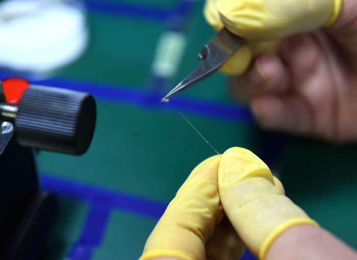 武汉楚星光纤应用技术有限公司生产车间一派繁忙景象,工作人员借助电子显微镜和电脑显示屏正在磨制和焊接头发丝般粗细的光纤,加工成高端透镜光纤,产品广泛应用在通信、传感等科技领域。 长江日报记者高勇摄 长江日报供图