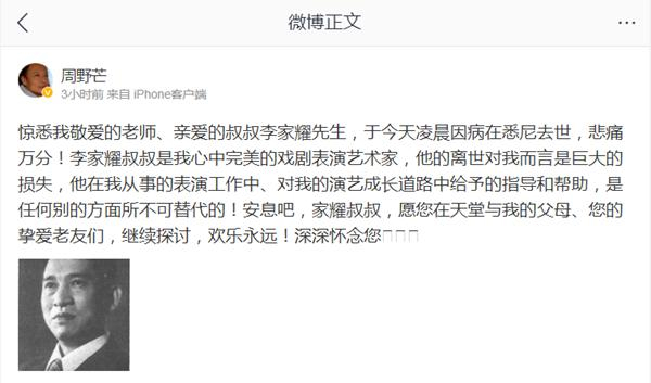1月30日晚,演员周野芒发布微博悼念戏剧表演艺术家李家耀:“惊悉我敬爱的老师、亲爱的叔叔李家耀先生,于今天凌晨因病在悉尼去世,悲痛万分!李家耀叔叔是我心中完美的戏剧表演艺术家……深深怀念您”。