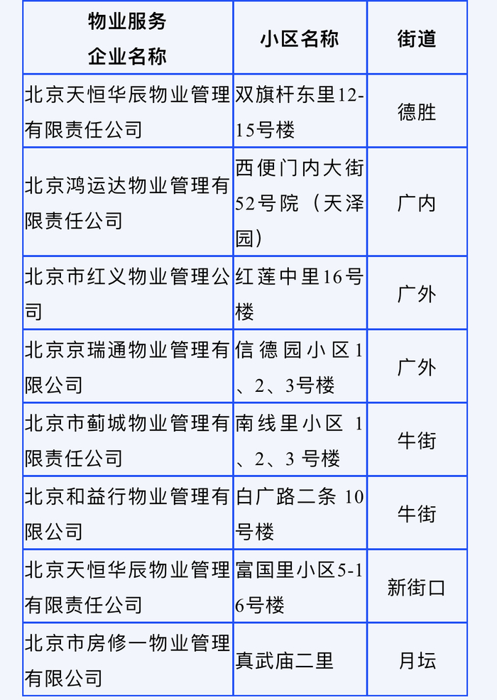 另外,西城区还公示了差评榜的8家物业企业,它们因物业服务水平低、维修养护不及时、投诉处理不力等原因上榜。这些物业企业管理的小区为德胜街道的双旗杆东里12-15号楼、广内街道的西便门内大街52号院(天泽园)、广外街道的红莲中里16号楼和信德园小区1-3号楼、牛街街道的南线里小区1-3号楼和白广路二条10号楼、新街口街道的富国里小区5-16号楼、月坛街道的真武庙二里。登上差评榜的物业企业有北京天恒华辰物业管理有限责任公司、北京鸿运达物业管理有限责任公司、北京市红义物业管理公司、北京京瑞通物业管理有限公司、北京市蓟城物业管理有限责任公司、北京和益行物业管理有限公司、北京市房修一物业管理有限公司。